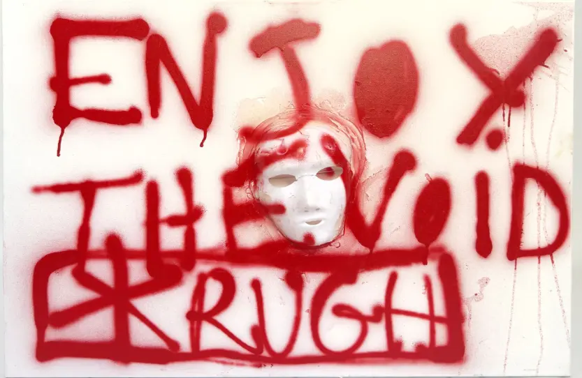 Un slogan criant : ENJOY THE VOID. Au centre, un masque blanc figé.