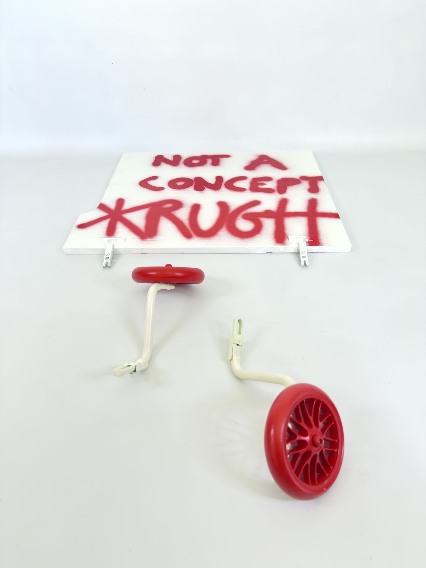 Les petites roues d’enfant, détachées, rappellent l’apprentissage et l’équilibre précaire. Mais elles sont désormais déposées au sol. Comme si l’artiste déclarait son œuvre sans plus aucune bride avec l’audace du risque nu, sans compromis.
